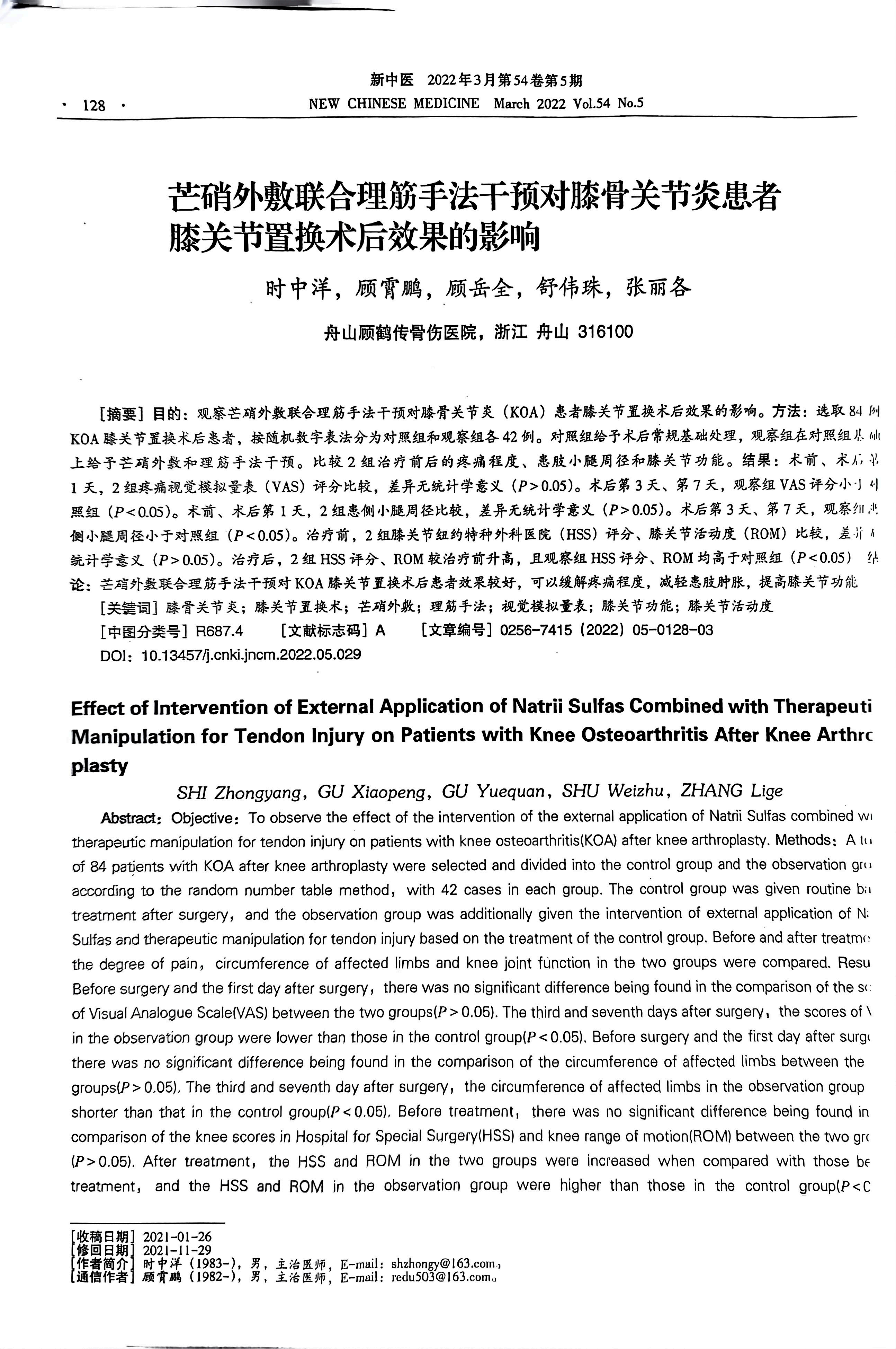 由我院時(shí)中洋、顧霄鵬、顧岳全、舒?zhèn)ブ榈柔t(yī)師參與撰寫的醫(yī)學(xué)論文《芒硝外敷聯(lián)合理筋手法干預(yù)對(duì)膝骨關(guān)節(jié)炎患者膝關(guān)節(jié)置換術(shù)后效果的影響》在中華中醫(yī)藥學(xué)會(huì)系列雜志《新中醫(yī)》2022年3月第54卷第5期上發(fā)表。