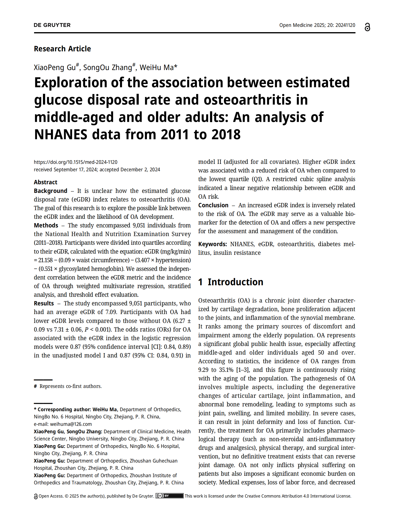 由我院顧霄鵬、張宋歐等醫(yī)師參與撰寫的醫(yī)學(xué)論文《Exploration of the association between estimated glucose disposal rate and osteoarthritis in middle-aged and older adults: An analysis of NHANES data from 2011 to 2018》于2025年2月4日在SCI期刊Open Med (Wars)上發(fā)表。